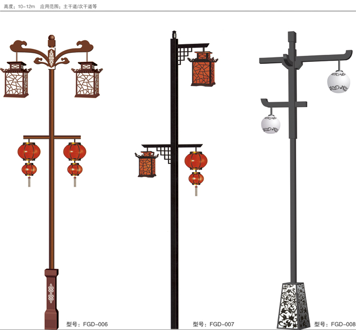 仿古燈結構簡潔,外形美觀流暢,主要應用于城市道路,古鎮,景觀亮化,旅游景區,公園庭院,廣場照明及亮化裝飾。仿古燈設計自然常態,在展示現代精美制造工藝的同時,又融入多種具有一定地方或民族文化特色的元素,即可美化亮化環境,又能成為一座城市一個地區一方民族文化的象征。無論是旅游景區還是園林古鎮都有他適合的道理極具觀賞和使用價值。